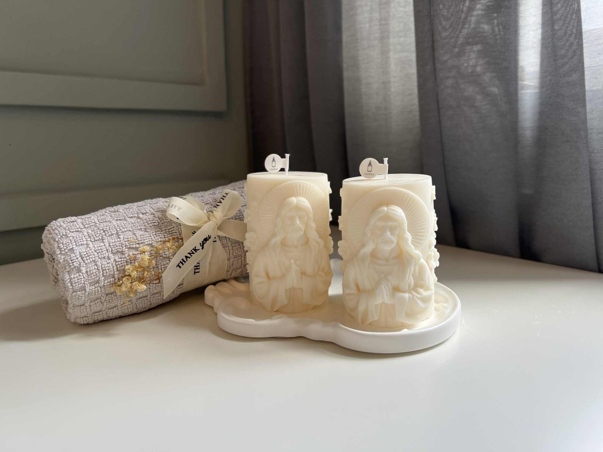 This unique handmade candle features a beautifully detailed sculpture of Jesus in prayer — a symbol of faith, peace, and spiritual light. Crafted with care from high-quality natural wax, it’s perfect for moments of reflection, as a sacred home decor piece, or a thoughtful religious gift. The floral details along the edges and the serene expression make it a truly special item for any spiritual space.