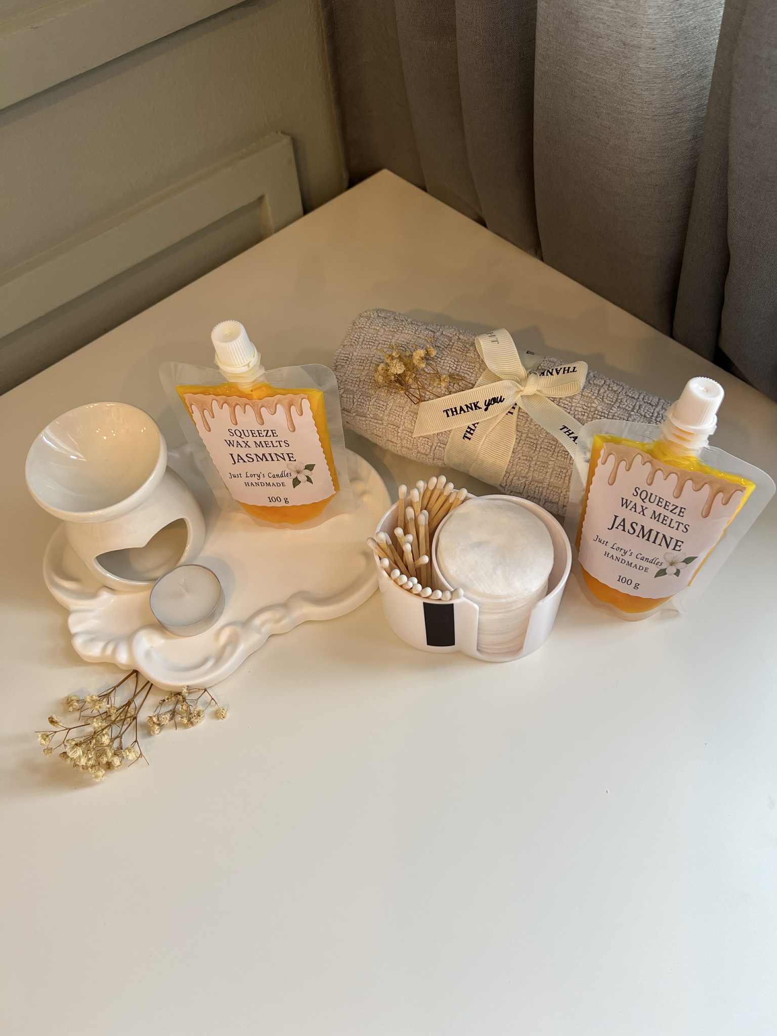 Inside you’ll find five of our most-loved scents – Rose, Jasmine, Cinnamon, Strawberry ,Vanilla, and Lavender – each handmade with natural, eco-friendly wax for a clean and long-lasting fragrance. Paired with elegant accessories, this set is ready to use and ready to gift.